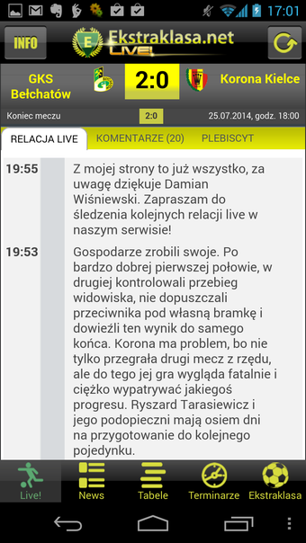 Ekstraklasa.net LIVE! to darmowa aplikacja dla wszystkich fanów polskiej piłki nożnej. Aplikacja jest mobilną wersją serwisu o tej samej nazwie i jest przeznaczona przede wszystkim dla fanów polskiej ligi.